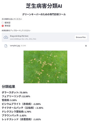 グリーンキーパー向けのWebアプリ。スマートフォンやPCから芝の病害画像をアップして、芝が暖地型/寒地型かを選ぶと、画像診断により9種類の病害からそれぞれの確率を表示します。こちらも無料サイト上での公開のため、スリープに入っているときは、起動ボタンを押してください。